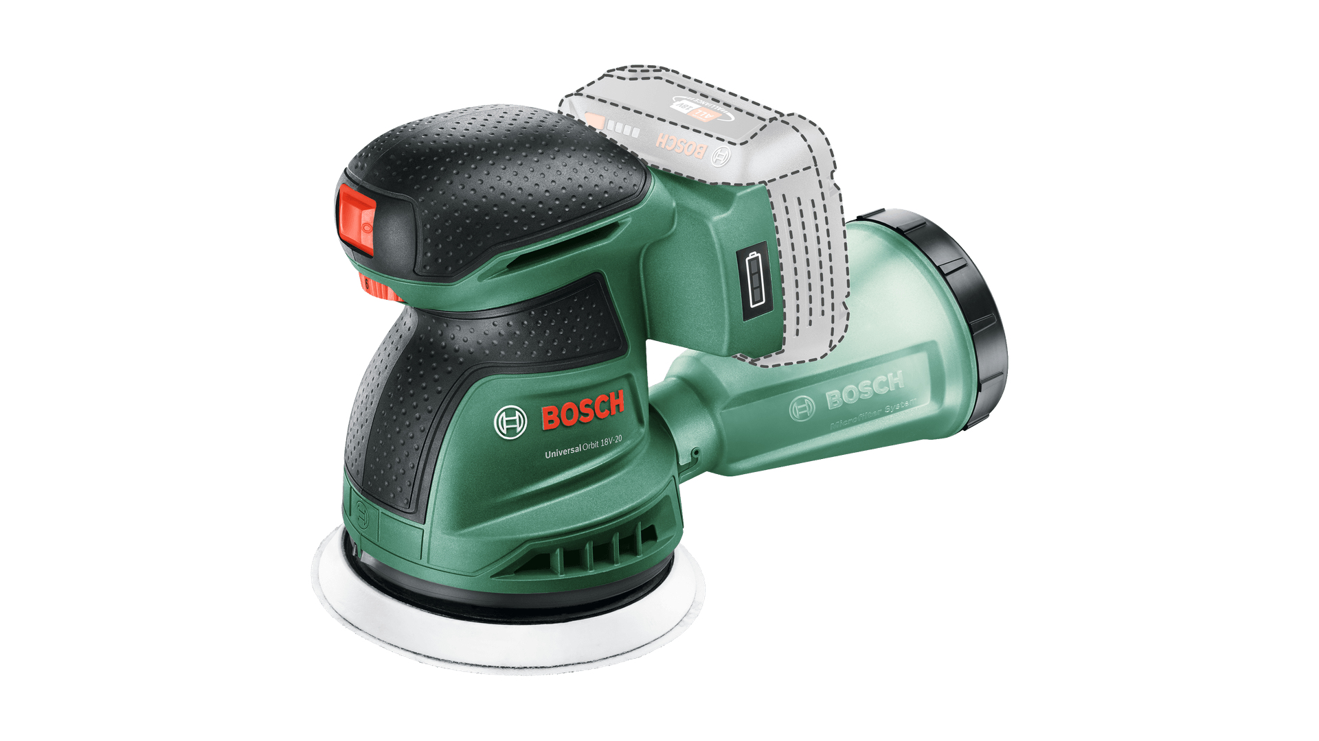 The Bosch UniversalOrbit 18V-20 random orbital sander ensures a high-quality sanded or polished finish on floors, furniture and other large flat or curved surfaces. With its powerful motor and electronic speed selection, sanding is efficient and speed can be adjusted precisely to suit a variety of different materials including wood, plaster, varnished or polished areas. The state-of-the art microfilter dust box minimises dust, ensuring a cleaner workspace and more comfortable handling. The built-in Bosch Syneon Electronic protects your tool and battery. The tool belongs to the 18V POWER FOR ALL system. One battery can be used in all 18V POWER FOR ALL tools.