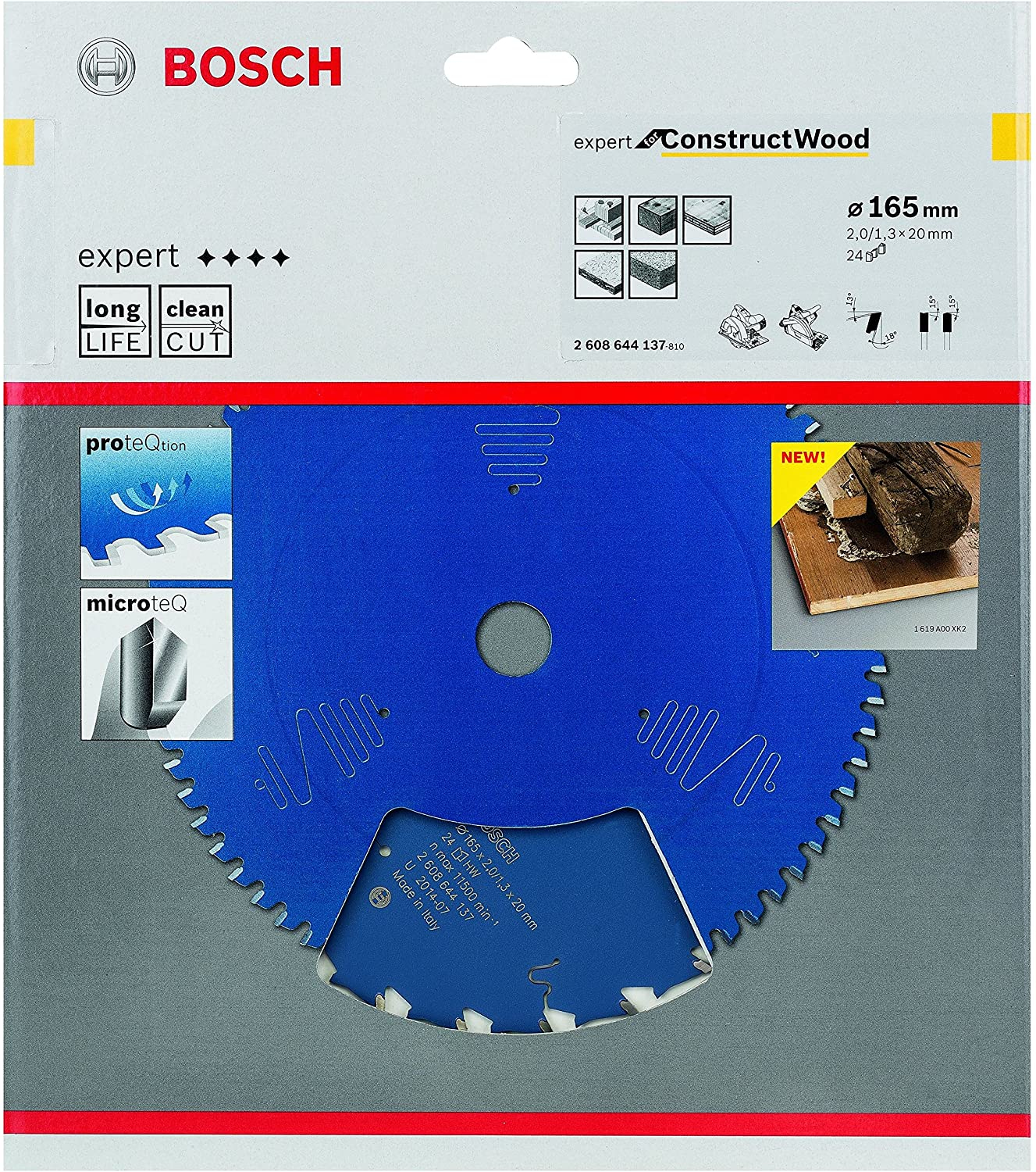 The Expert for Construct Wood Circular Saw Blade is strongly resistant when cutting construction wood. Its unique extra-hard Microteq teeth are produced in-house by Bosch from highly durable carbide grains, enabling high-performance cutting and a long lifetime. This is further supported by the blade´s combination of a special tooth design and a wide tooth spine. Furthermore, its specially designed anti-vibration slots enable particularly smooth cutting with considerably less noise and significantly reduced vibration. Additionally, the Expert for Construct Wood Circular Saw Blade features Proteqtion coating, which prevents corrosion and delivers reliable cutting while reducing friction. Use this saw blade in construction site timber with foreign bodies such as nails and concrete residues. It is compatible with plunge and hand-held saws. The Expert for Construct Wood Circular Saw Blade features an ATB (Alternate Top Bevel)+Pyramid tooth geometry for effortless cutting in construction wood with or without nails.