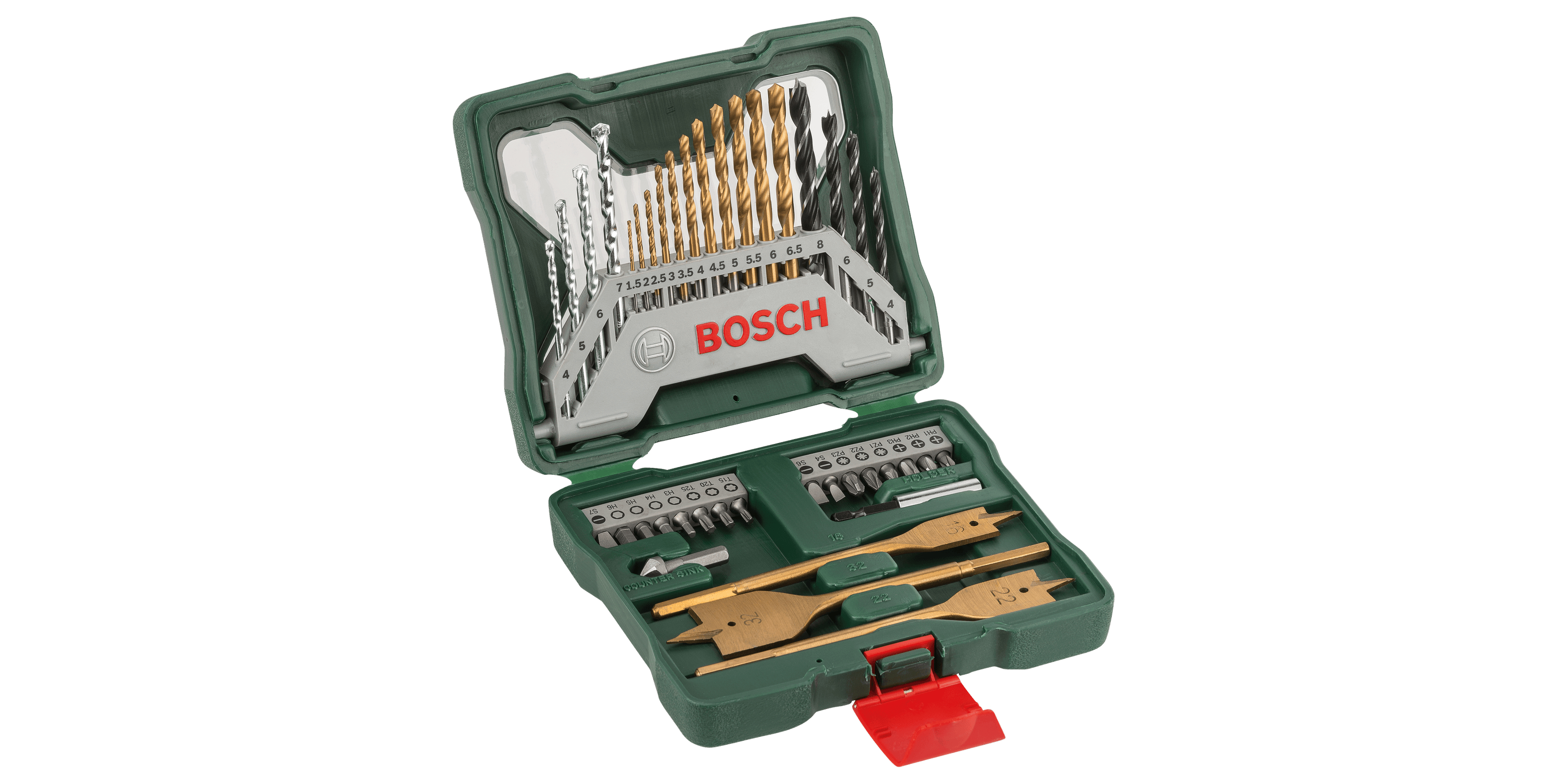 11 HSS-TiN metal drill bits, diameter 1.5-6.5 mm 4 TC masonry drill bits, diameter 4-7 mm 4 wood drill bits, diameter 4-8 mm 3 spade bits, Titanium, diameter 16/22/32 mm 16 screwdriver bits, L = 25 mm PH 1/2/3 PZ 1/2/3 S 4/6/7 HEX 3/4/5/6 T 15/20/251 Universal holder, magnetic 1 countersink
