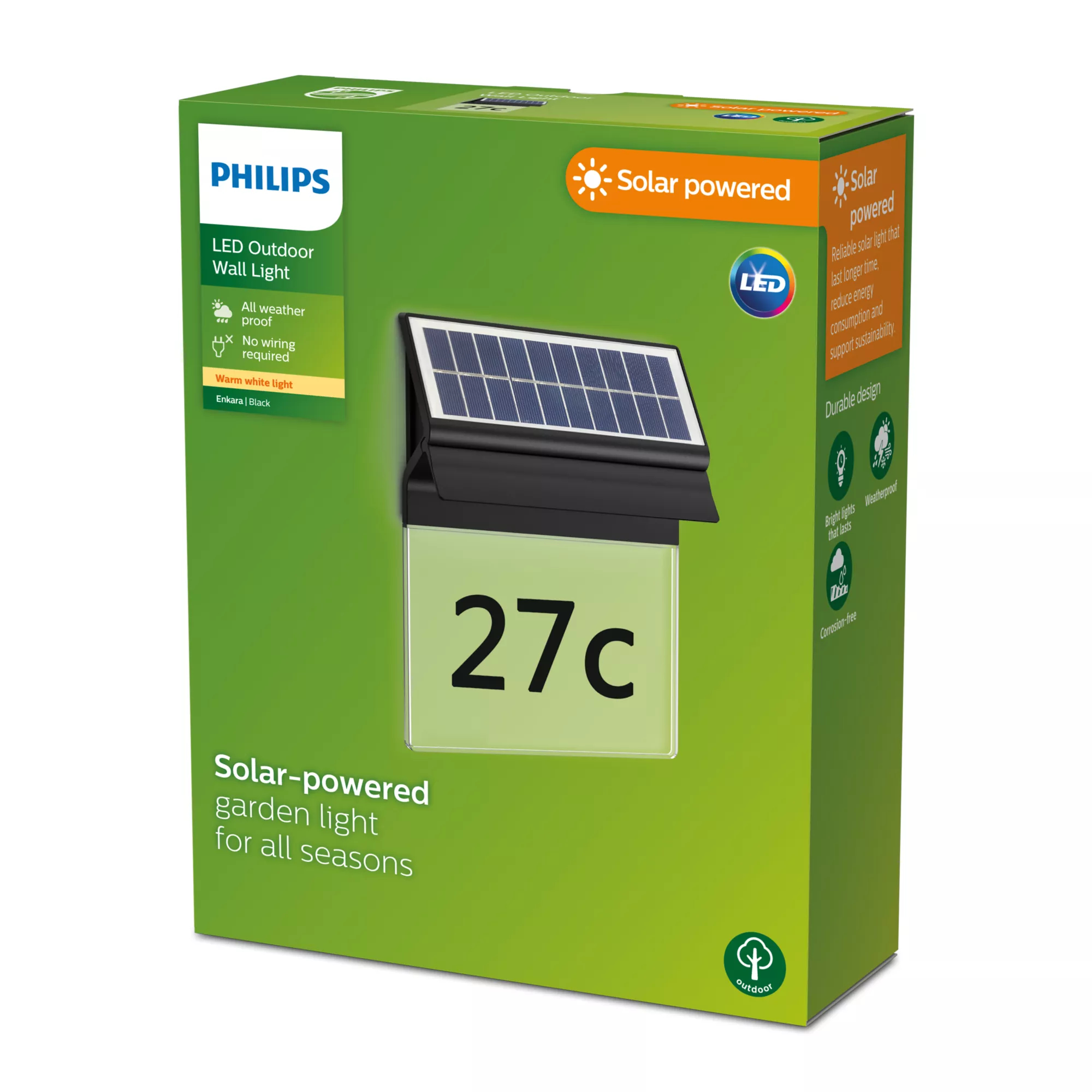 Philips Enkara house number light is a reliable solar light that lasts for a longer time, reduces energy consumption and supports sustainability.
