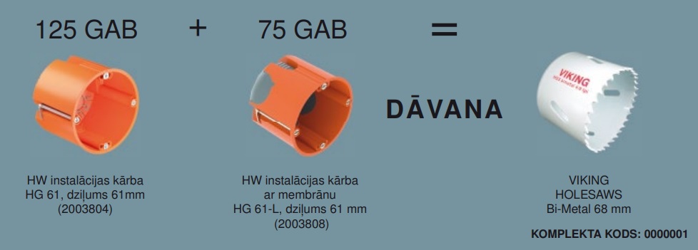 Pērkot 125 gab. HW instalācijas kārbas HG 61, kuru dziļums 61mm un 75 gab. HW instalācijas kārba s ar membrānu HG 61-L, kuru dziļums 61 mm, dāvanā saņem VIKING HOLESAWS Bi-Metal 68 mm kroņurbi.