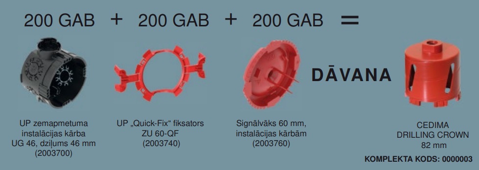 Pērkot 200 gab. UP zemapmetuma instalācijas kārbas UG 46, kuru dziļums 46 mm, 200 gab. UP „Quick-Fix“ fiksatorus ZU 60-QF un 200 gab. signālvākus (60 mm) instalācijas kārbām, dāvanā saņem CEDIMA DRILLING CROWN 82 mm kroņurbi.