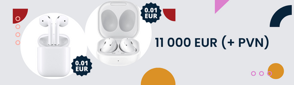 Оборот в интернет-магазине за период акции 11 000 EUR (+ НДС) – специальная цена 0,01 EUR на беспроводные наушники AirPods или Galaxy Buds.